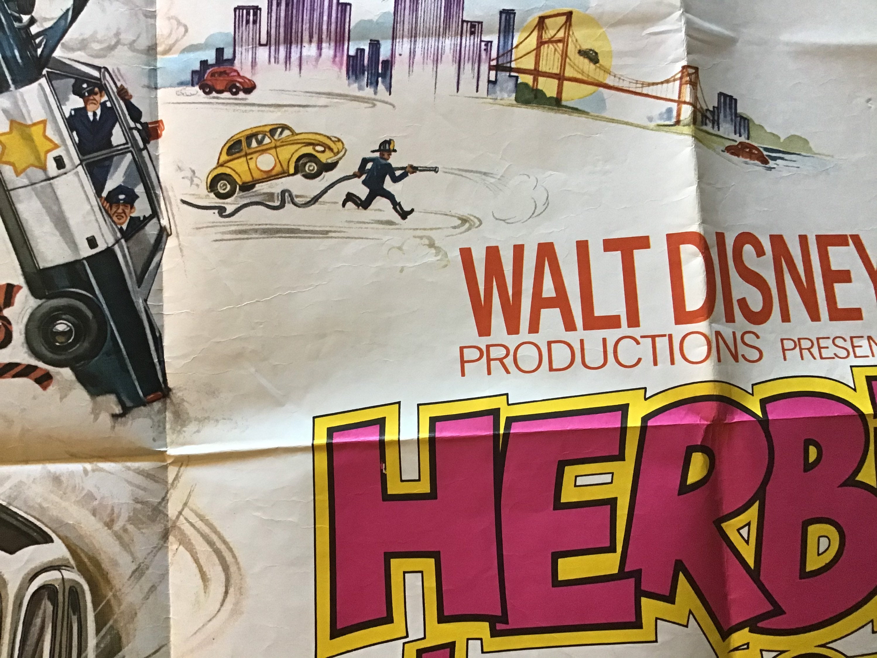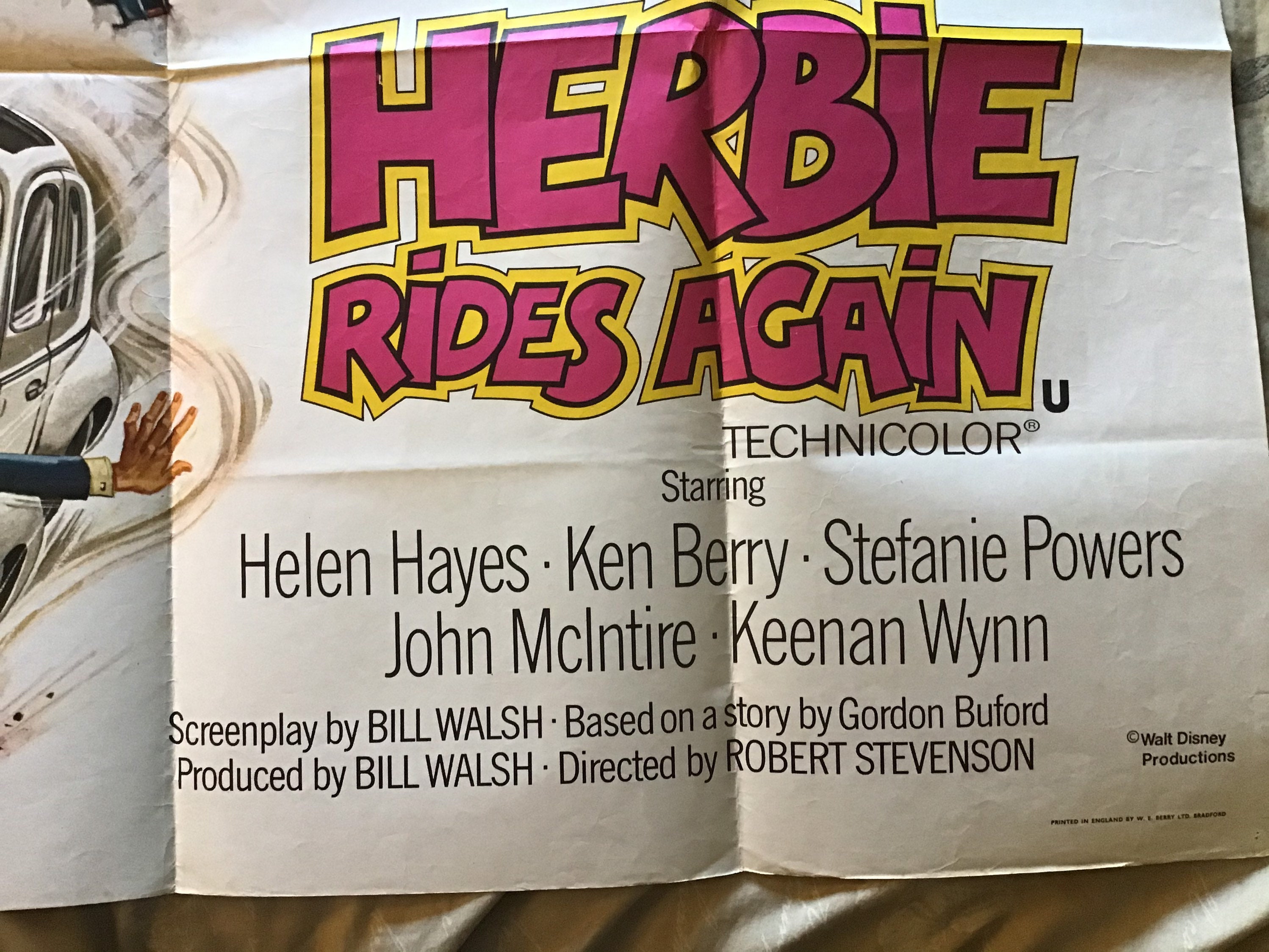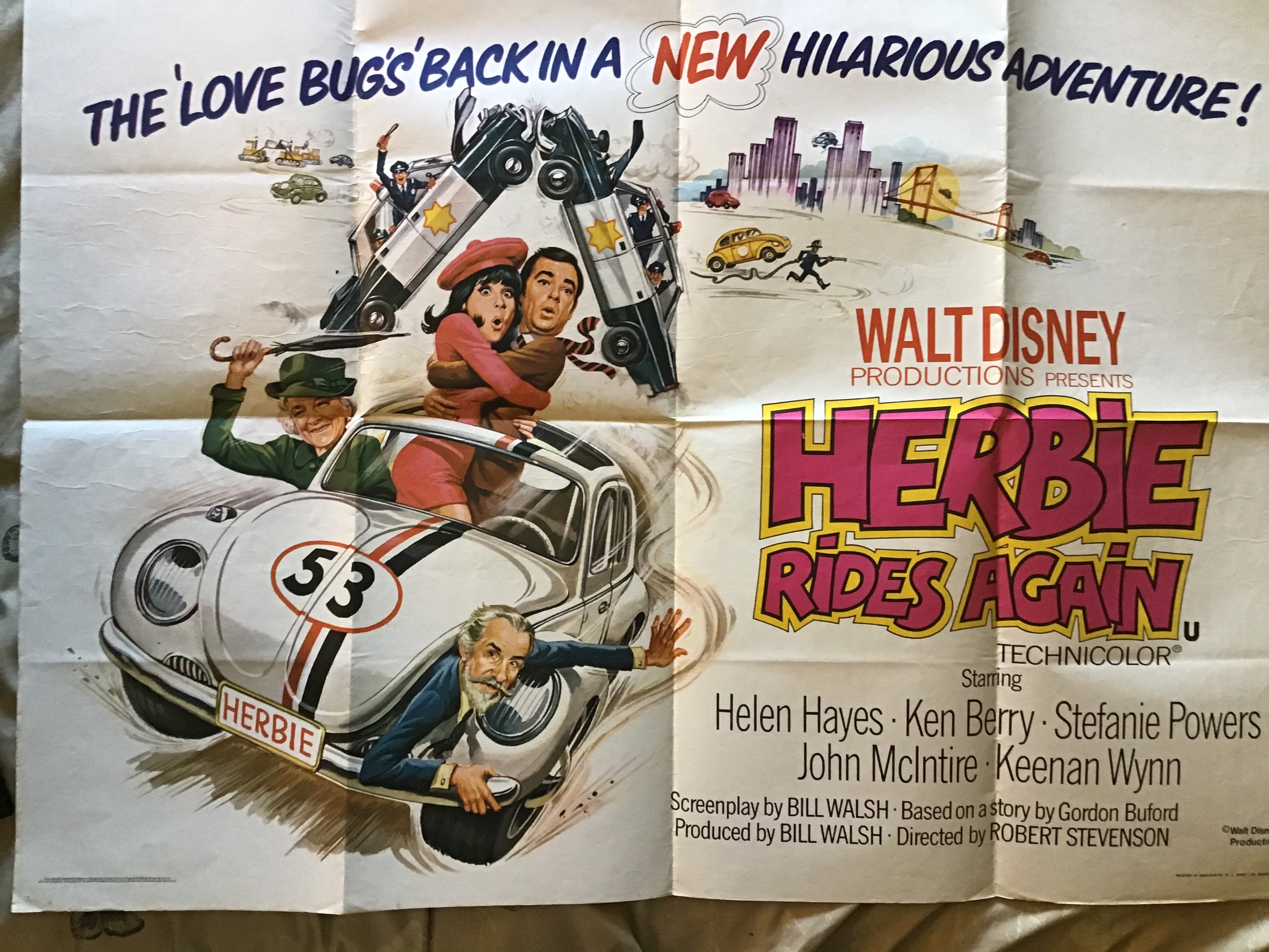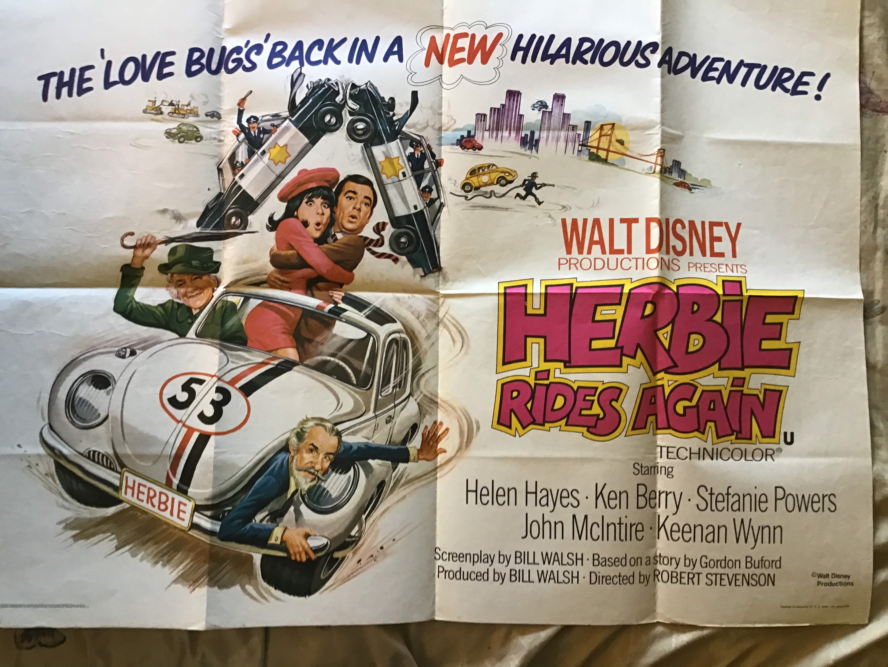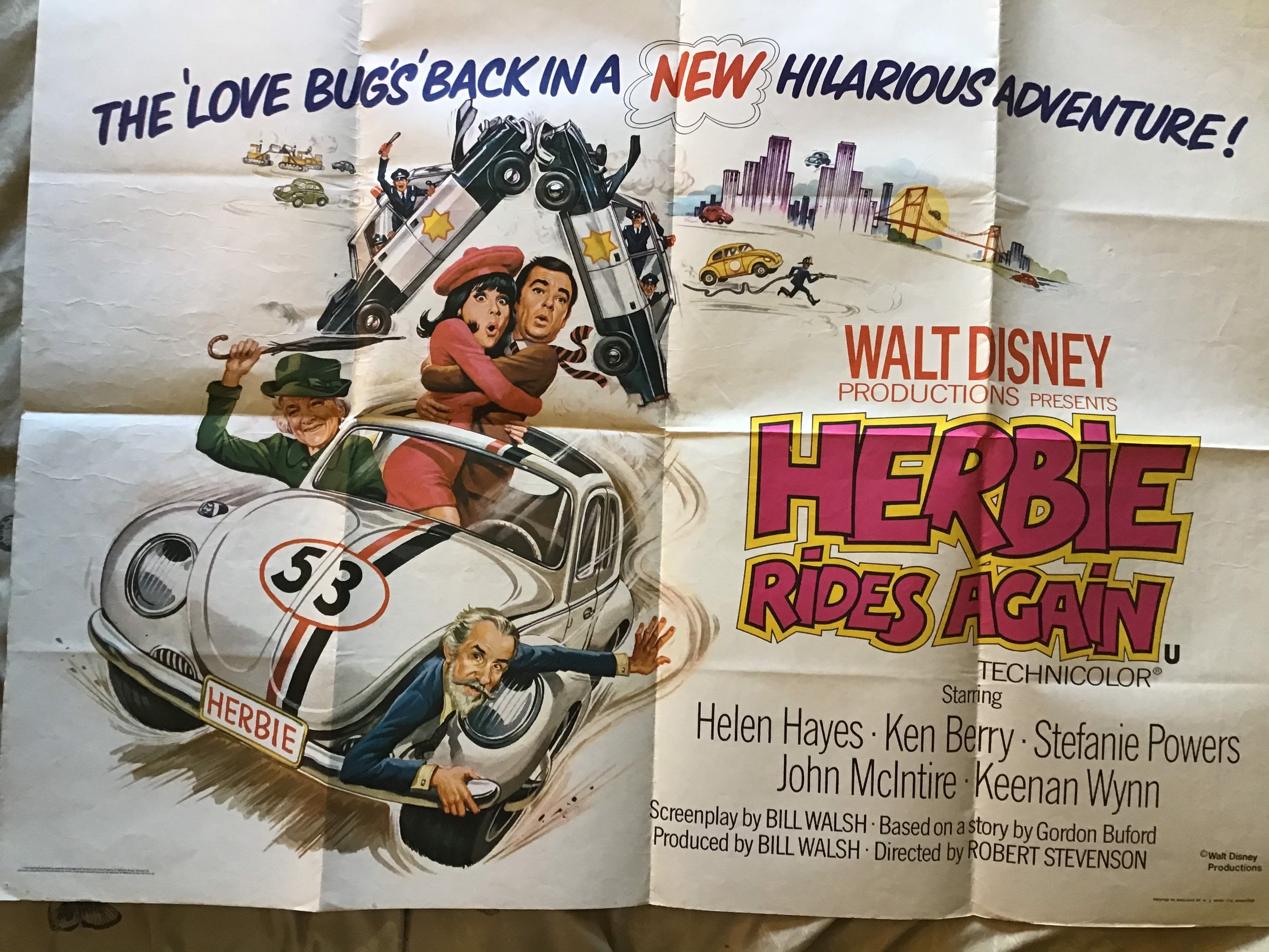Herbie Rides Again Original British Quad Movie Poster This fantastic 46 year old original movie poster is 30” x 40” There are some pinholes in the corners and a tiny amount of fraying to the edges this poster has been loved by some in the past and taken pride and place on there wall This great original movie poster from the 1974 staring Helen Hayes, Ken Barry and Stephanie Powers and produced for the Walt Disney company by W E Berry LTD of Bradford UK This great original poster will look amazing framed and mounted on any wall domestic or industrial or Comercial This will make a great gift for any fan of the herbie movies or just any vw fan as the art work is amazing and I believe that it was drawn by Paul E Wenzel This poster has fold marks as these British quad posters used to be folded to fit in the film can ,on distribution to your local cinema and return after the screening had finished
